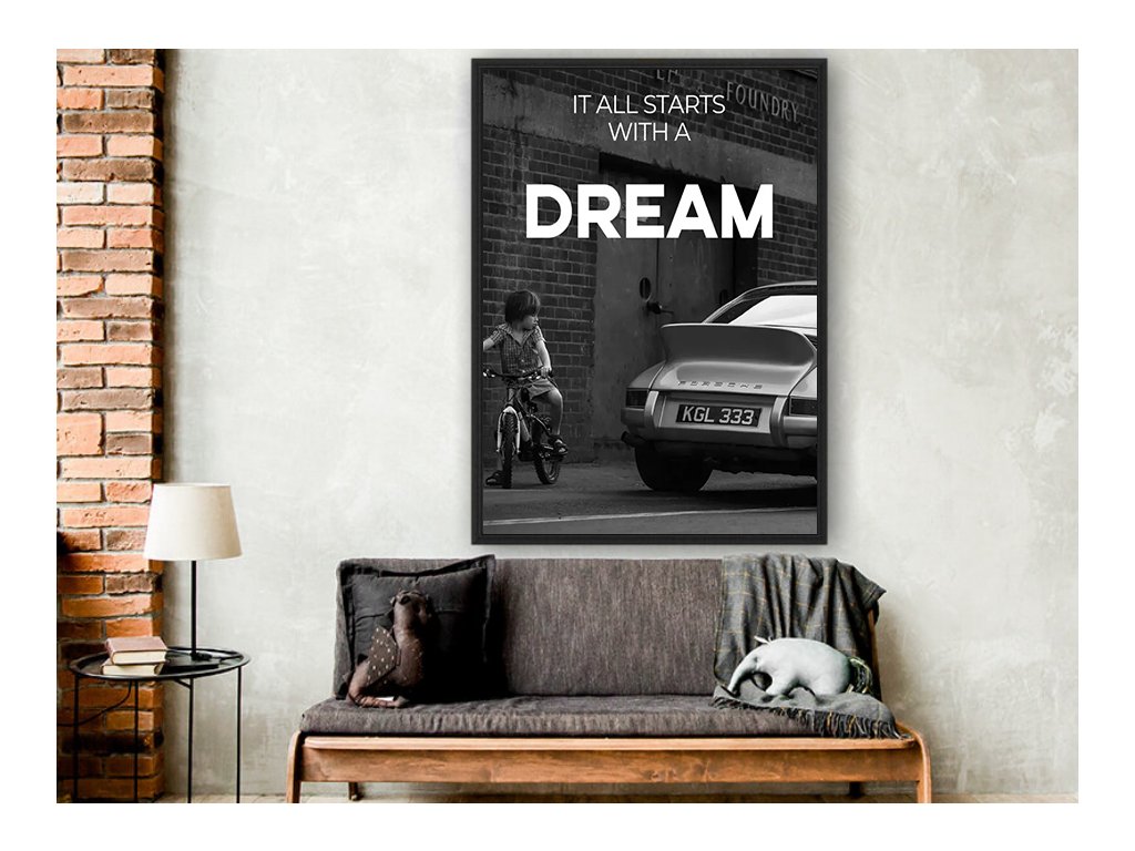 Nadčasový černobílý obraz zachycující malého chlapce na kole, který s obdivem hledí na ikonický sporťák – to je vizuální připomínka toho, že každá velká věc začíná snem. Nápis "It All Starts With a Dream" motivuje snít ve velkém a jít si za svými cíli bez ohledu na to, kde právě jsi.