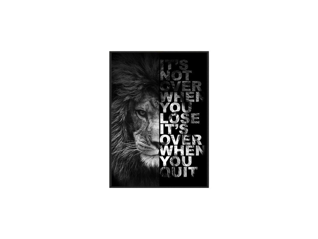 Tento výjimečně silný obraz s tváří lva a motivačním textem "It’s not over when you lose, it’s over when you quit" je skutečnou oslavou odolnosti a vytrvalosti. Lev jako symbol síly a odhodlání v kombinaci s kontrastní černobílou grafikou vytváří nepřehlédnutelný vizuální dojem a dodává vnitřní sílu v každodenním boji za sny.