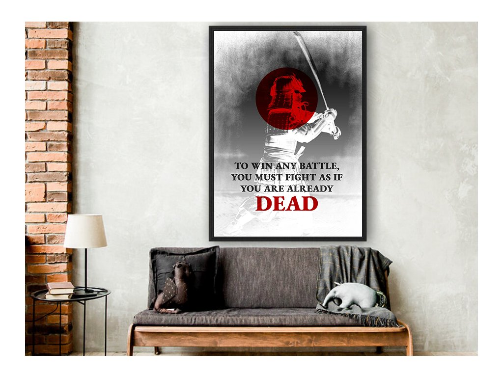 Síla, čest a odhodlání. Tento dramatický obraz se siluetou samuraje a silným citátem "To win any battle, you must fight as if you are already dead" v sobě nese hlubokou filozofii bojovníků – odvahu jít naplno, bez strachu a s naprostým soustředěním na výsledek. Stylizované červené slunce a kontrastní černobílá kompozice dělají z obrazu nejen motivaci, ale i umělecký zážitek.